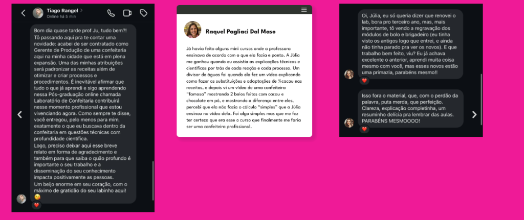 A estrutura do Laboratório de Confeitaria foi pensada para formar confeiteiros de verdade. São 7 módulos com o conteúdo fundamental que todo profissional da confeitaria precisa dominar — da base técnica à gestão do negócio. E pra completar a sua jornada, você ainda recebe 8 bônus exclusivos que vão turbinar o seu aprendizado e acelerar seus resultados!